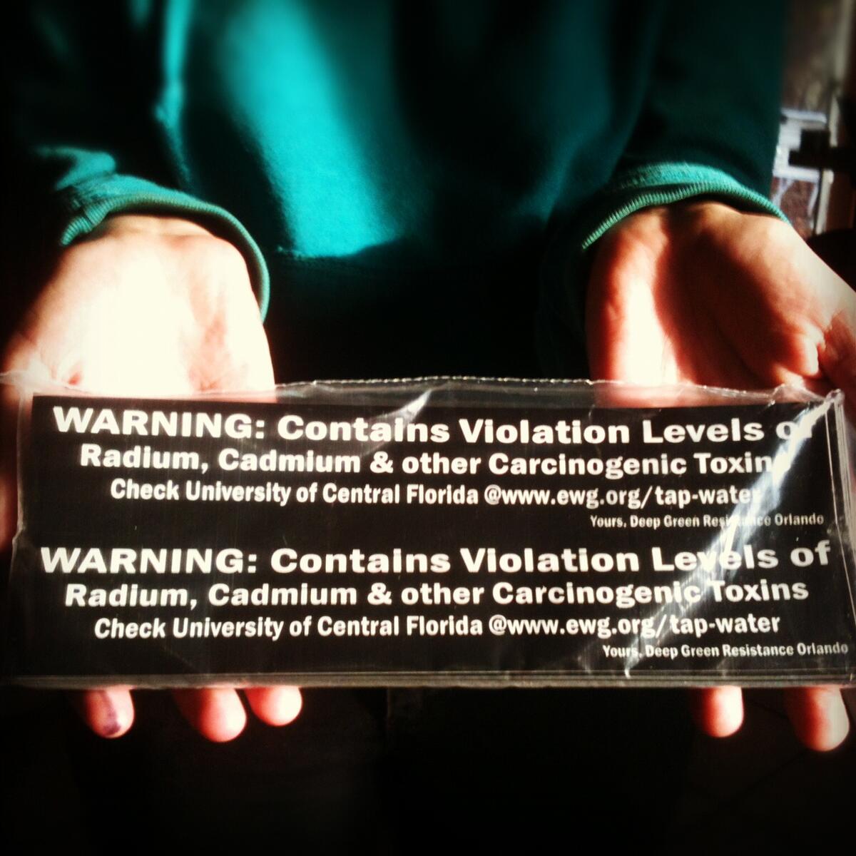 Recently, you may have noticed a sticker on many of the water fountains around the University of Central Florida campus with the stark warning: “Contains Violation Levels of Radium, Cadmium & other Carcinogenic Toxins…Yours, Deep Green Resistance Orlando.”